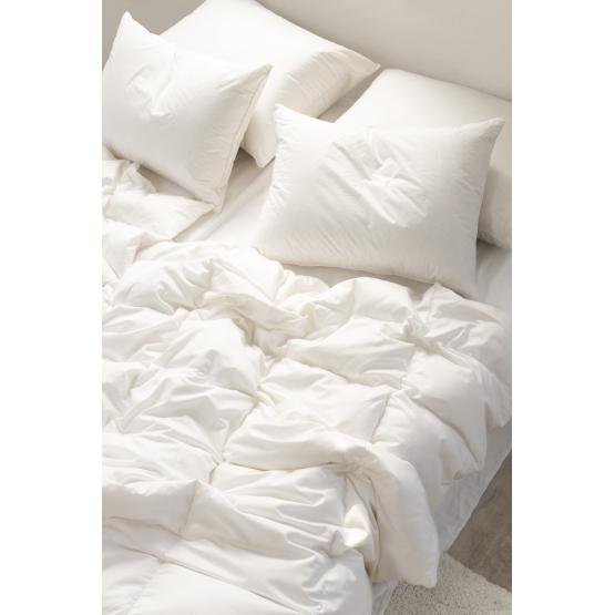 Fyllet består av 100 % europeisk moskus andedun som gir lav vekt, luftighet og myk komfort – ideelt for varme netter. Trekket er i TC395 (50 % høykvalitets bomullsbatist og 50 % TENCEL™), en tettvevd, silkemyk kvalitet som effektivt leder fukt bort fra kroppen og sørger for naturlig temperaturregulering. Resultatet er en sval, behagelig dyne som holder deg tørr, avspent og uthvilt.