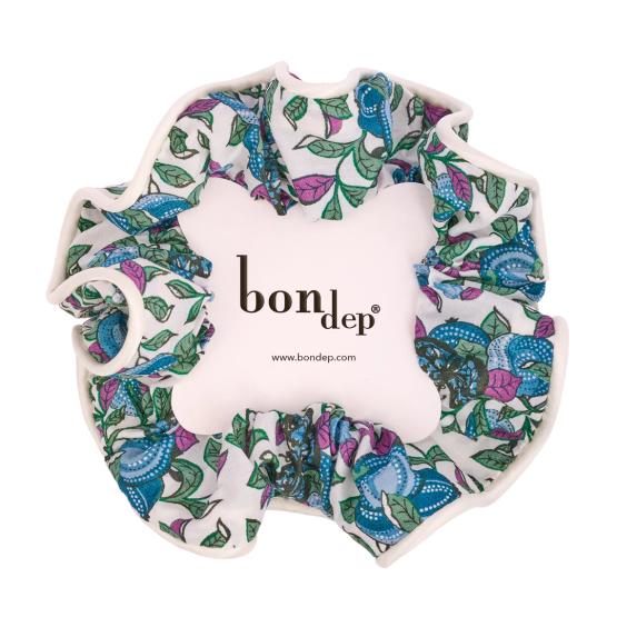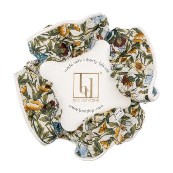 En nydelig scrunchie i det romantiske liberty mønsteret Orchard, med delikate blomster og et tidløst uttrykk. Den myke bomullen gir en lett og behagelig følelse, samtidig som strikken holder håret godt på plass uten å lugge.