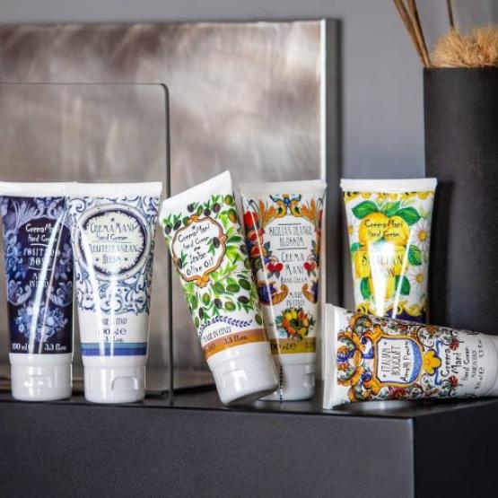 En luksuriøs herlig velduftende håndkrem med fuktighetsgivende ingredienser som Aloe Vera og Vit E og med dufter inspirert av Italias planter og frukter. Trekker lett inn i huden og etterlater den myk og full av duft og fuktighet.