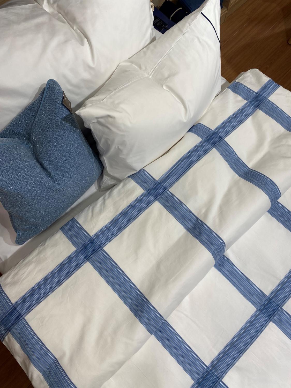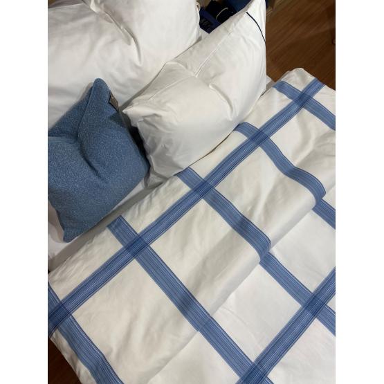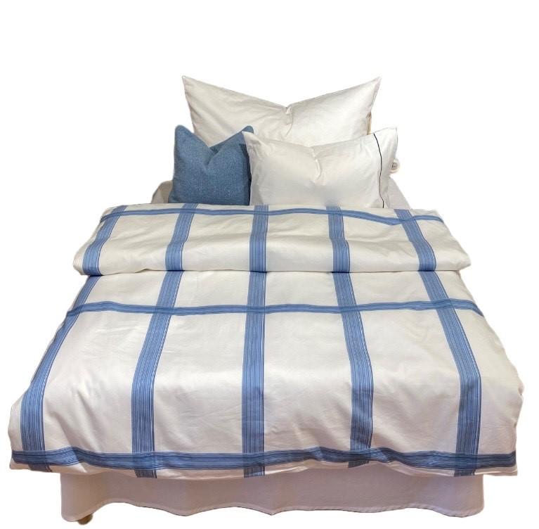 Putevaret er ensfarget hvit med en tynn, blå stripe. Dynetrekket har blå ruter over det hele.